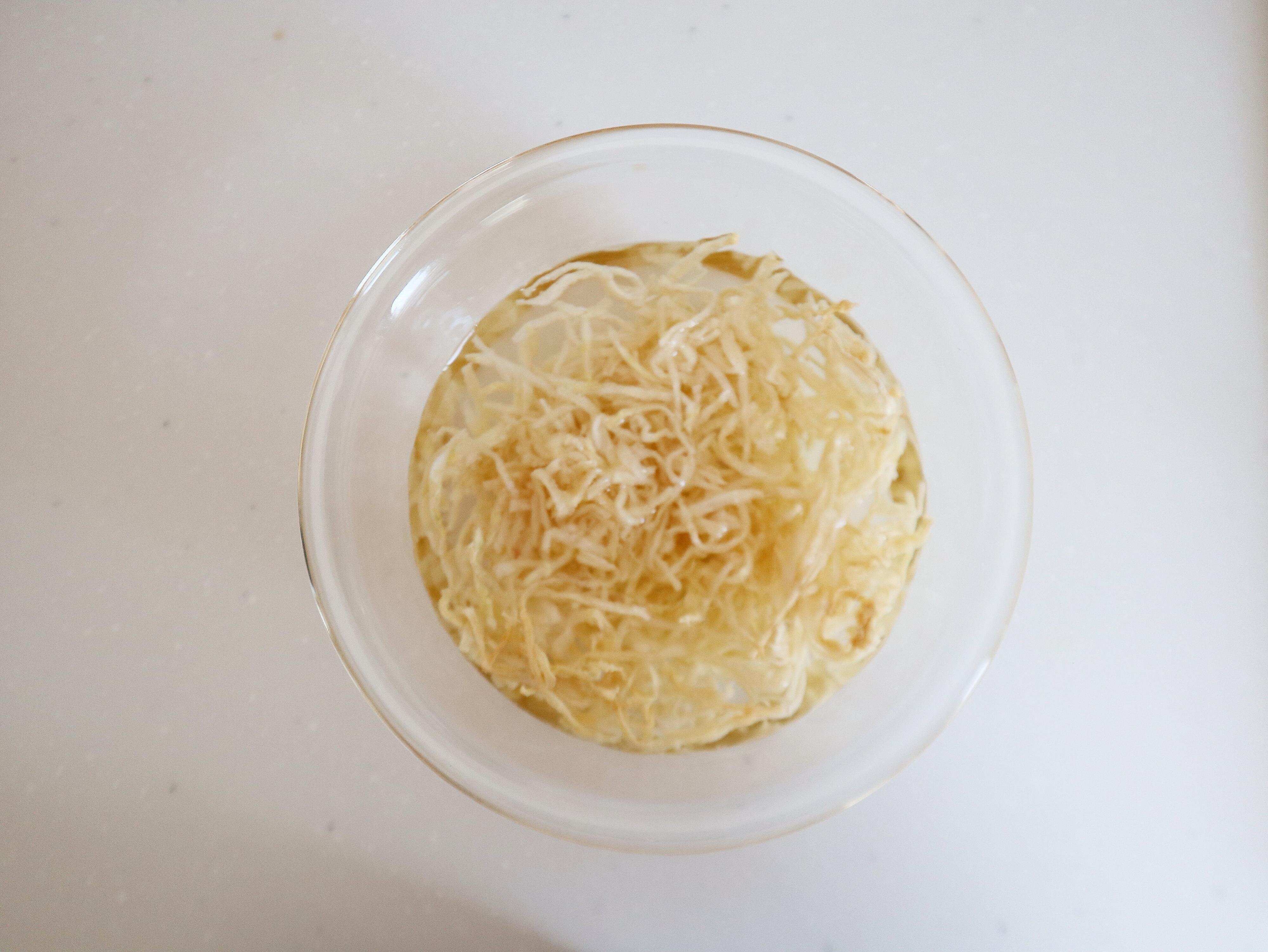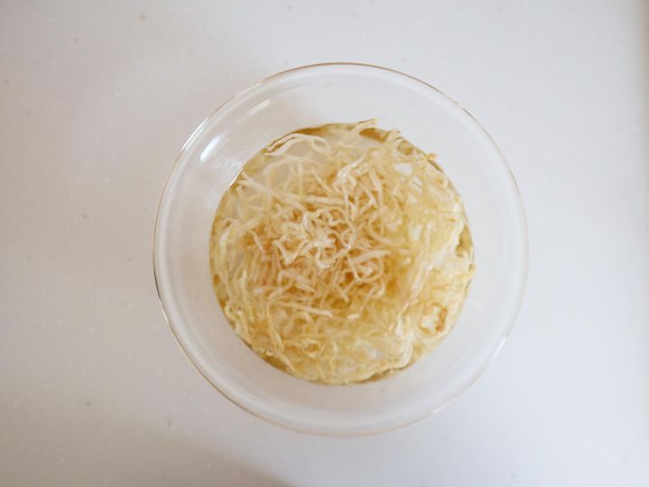 (1) 切り干し大根を水(250ml)で戻し、軽くしぼって食べやすい大きさに切る。※戻し汁は使うので捨てないこと。