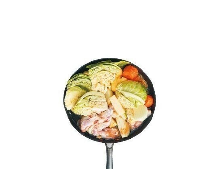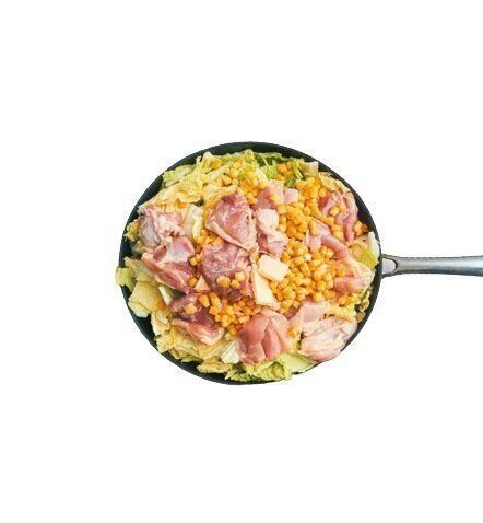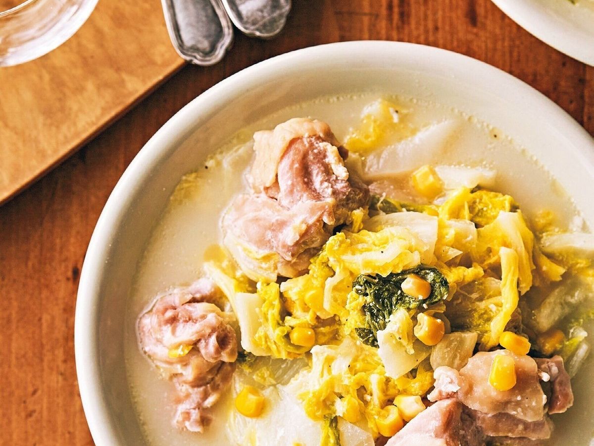 フライパンに白菜→鶏肉→コーン→牛乳→スープの素→バターの順に入れる。ふたをして中火にかけ、煮立ったら約10分、鶏肉に火が通るまで蒸し煮に。