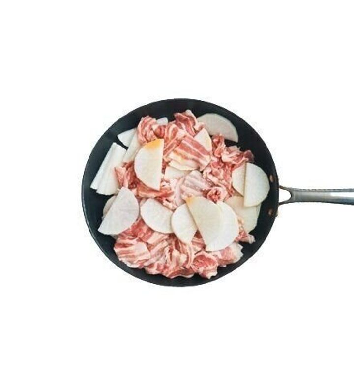 フライパンに豚肉と大根を交互に重ね入れてごま油をかけ、水1/3カップを加える。ふたをして中火にかけ、煮立ったら5~7分、大根に火が通るまで蒸し煮に。