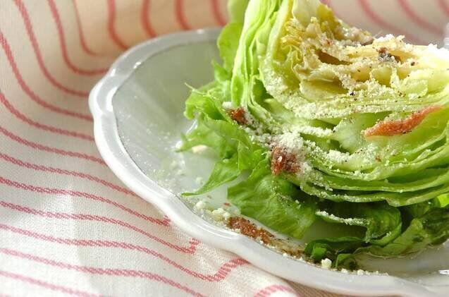 レタスを洗って千切りにし、アンチョビをのせて熱したオリーブオイルをかければ完成します。最後にコショウと粉チーズをかけて食卓に出しましょう。