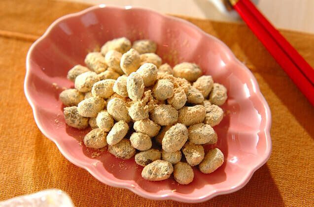 冷凍しておいた黒豆は、冷蔵庫に移して自然解凍してからきな粉をまぶしてください。きな粉をまぶすと一見黒豆には見えないため、お茶菓子としてお客さまに出してみてもよいでしょう。