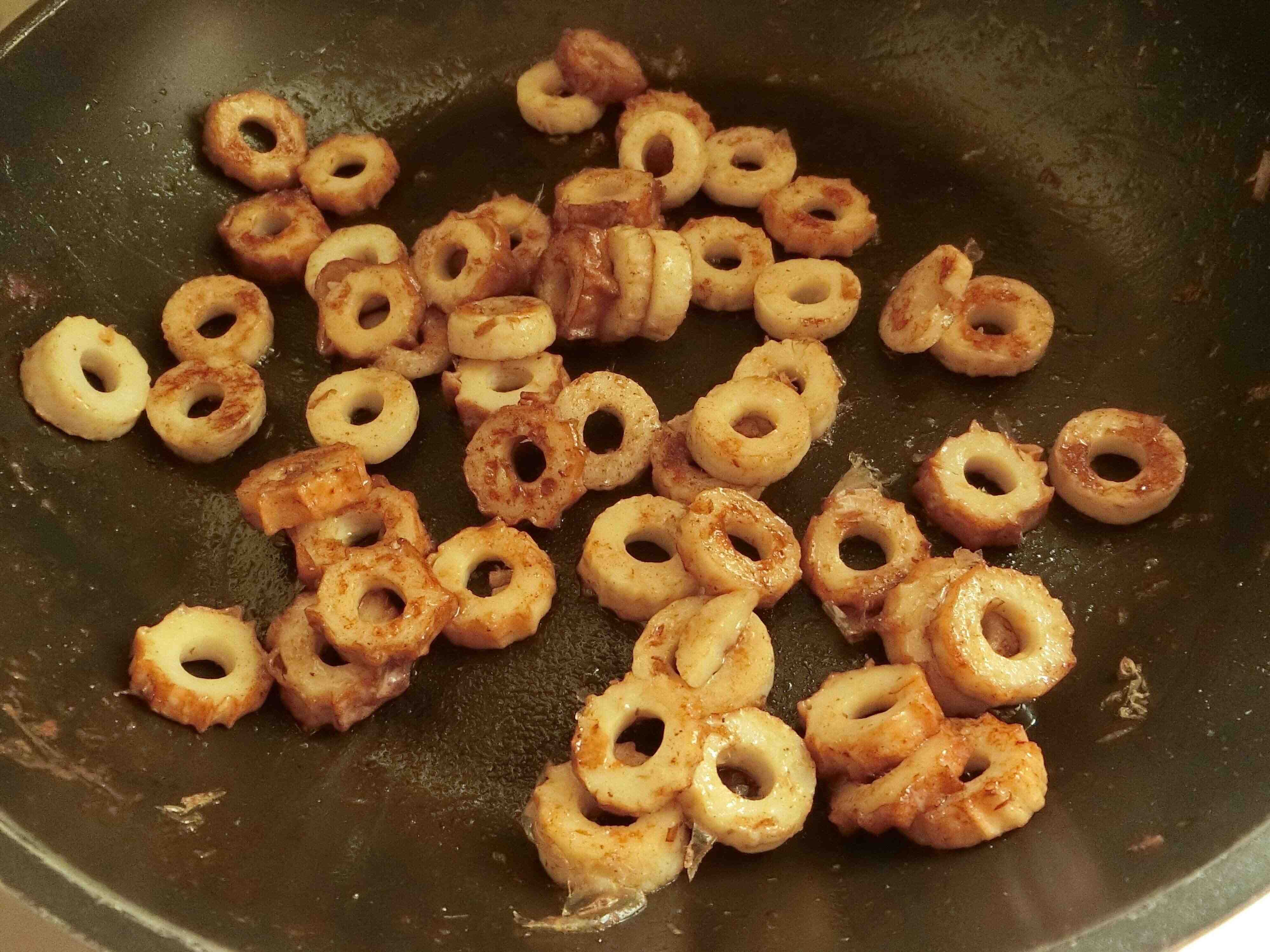 2.フライパンにマヨネーズとしょう油を入れて混ぜ合わせ、火をつけます。ふつふつしてきたらちくわを入れて炒めます。