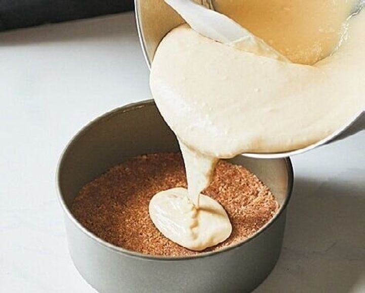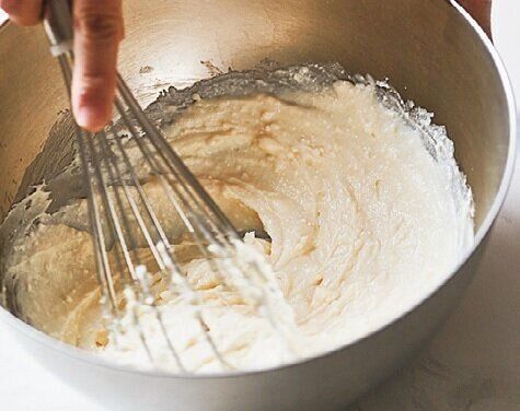 (1)ボウルにクリームチーズを入れ、ゴムべらで練り混ぜ、砂糖を加えて混ぜる。豆腐を加えて泡立て器で混ぜ、溶き卵を加えて混ぜる。薄力粉、レモンの絞り汁を順に加えて混ぜる。