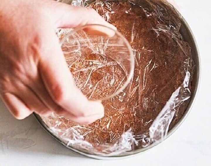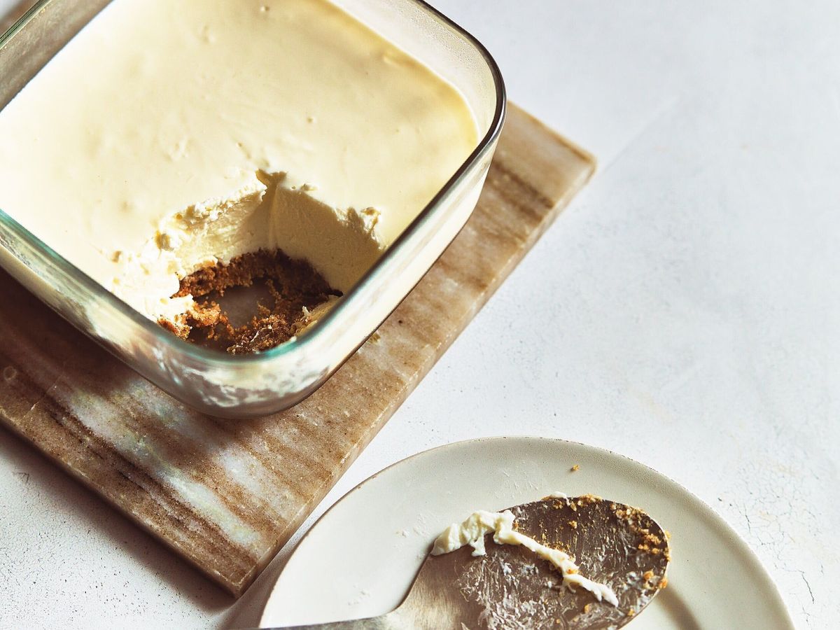 厚手のポリ袋にシンプルなビスケット80g(全粒粉タイプにすると、さらにヘルシー!)を入れてめん棒で細かく砕き、溶かしバター40gを加えてなじませる。型や容器の底に敷き詰め、ラップをのせてコップの底などで押しつけ、冷蔵室で5~6分冷やし固める。