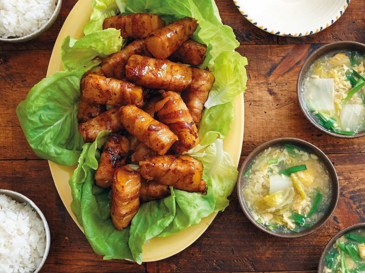 フライパンにサラダ油を強めの中火で熱し、(2)を巻き終わりを下にして並べる。5分ほどかけて全面をこんがりと焼き色がつくまで焼き、ペーパータオルでフライパンの脂を拭く。よく混ぜた[A]を加え、時々返しながら汁けがからむまで加熱する。器にサラダ菜を敷き、肉巻きを盛る。(小林)