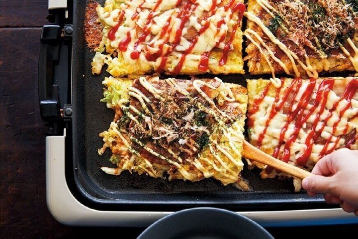 ホットプレートを高温(230~250℃)に予熱してサラダ油を熱し、(1)を全体に広げる(ホットプレートの縁は2~3cm空ける)。4カ所に豚肉を2枚ずつ半分に折ってのせ、5分ほど焼く。フライ返しで4等分に切って返し、中温(180~200℃)に下げてさらに5分焼く。再度上下を返し、2枚は[B](お好み焼き味)、残りに[C](ピザ味)をかけて仕上げる。(市瀬)