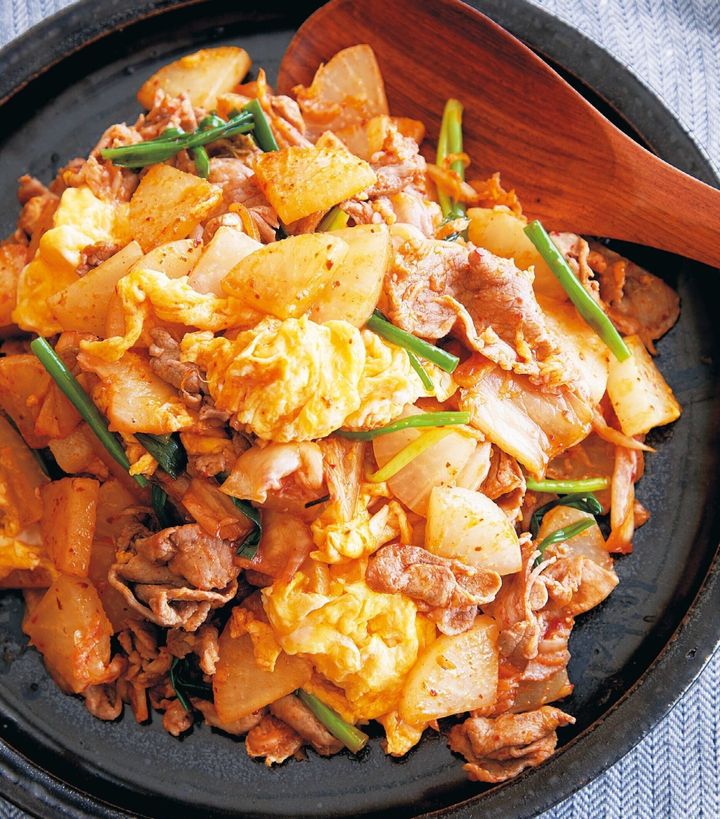 フライパンの空いた所で豚肉を炒め、色が変わったら白菜キムチ、万能ねぎ、しょうゆを加えて全体を炒め合わせる。(1)の卵を戻し入れ、さっと混ぜる。(市瀬)