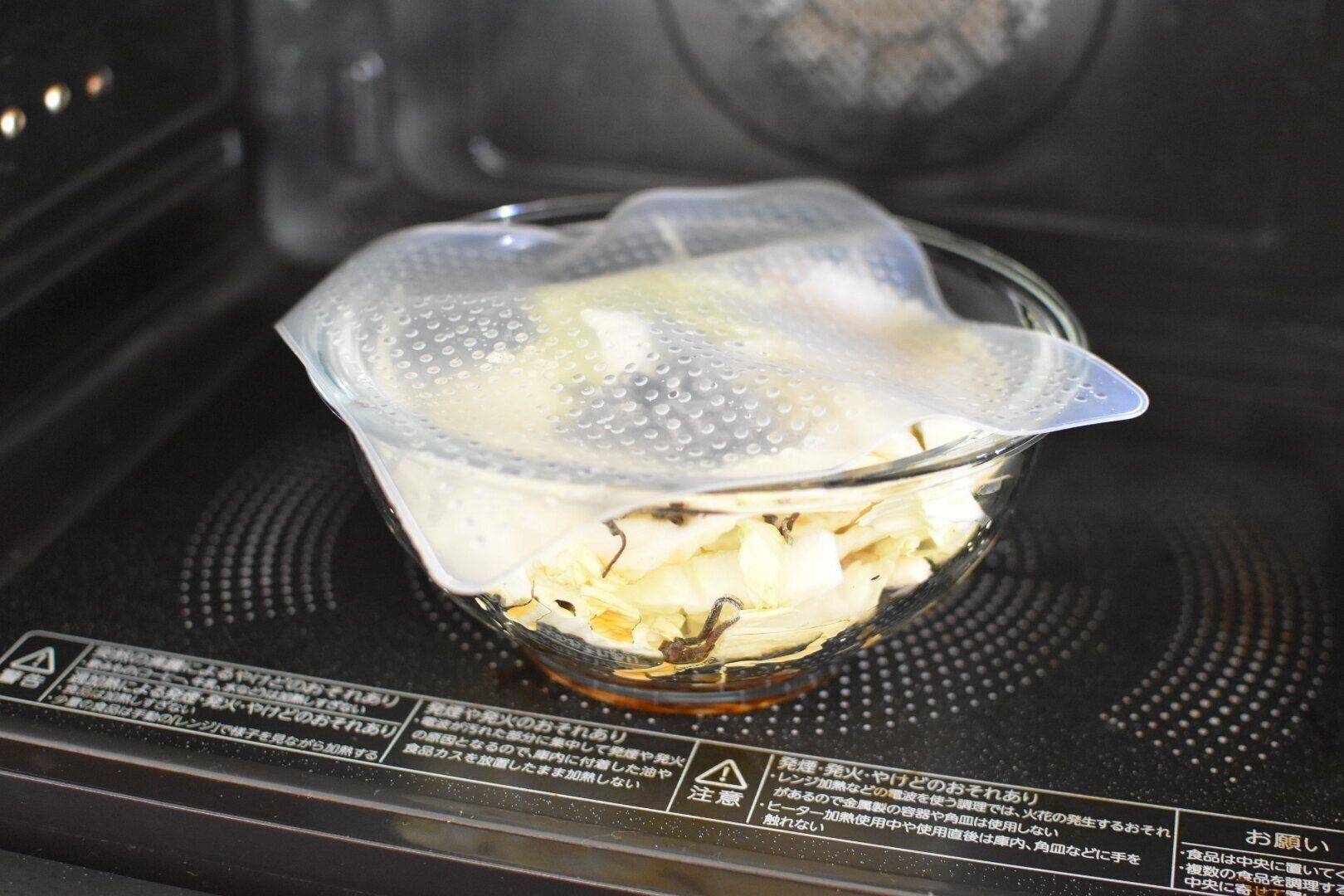 2.ふんわりとラップをかけたら600Wで約3分加熱して取り出す