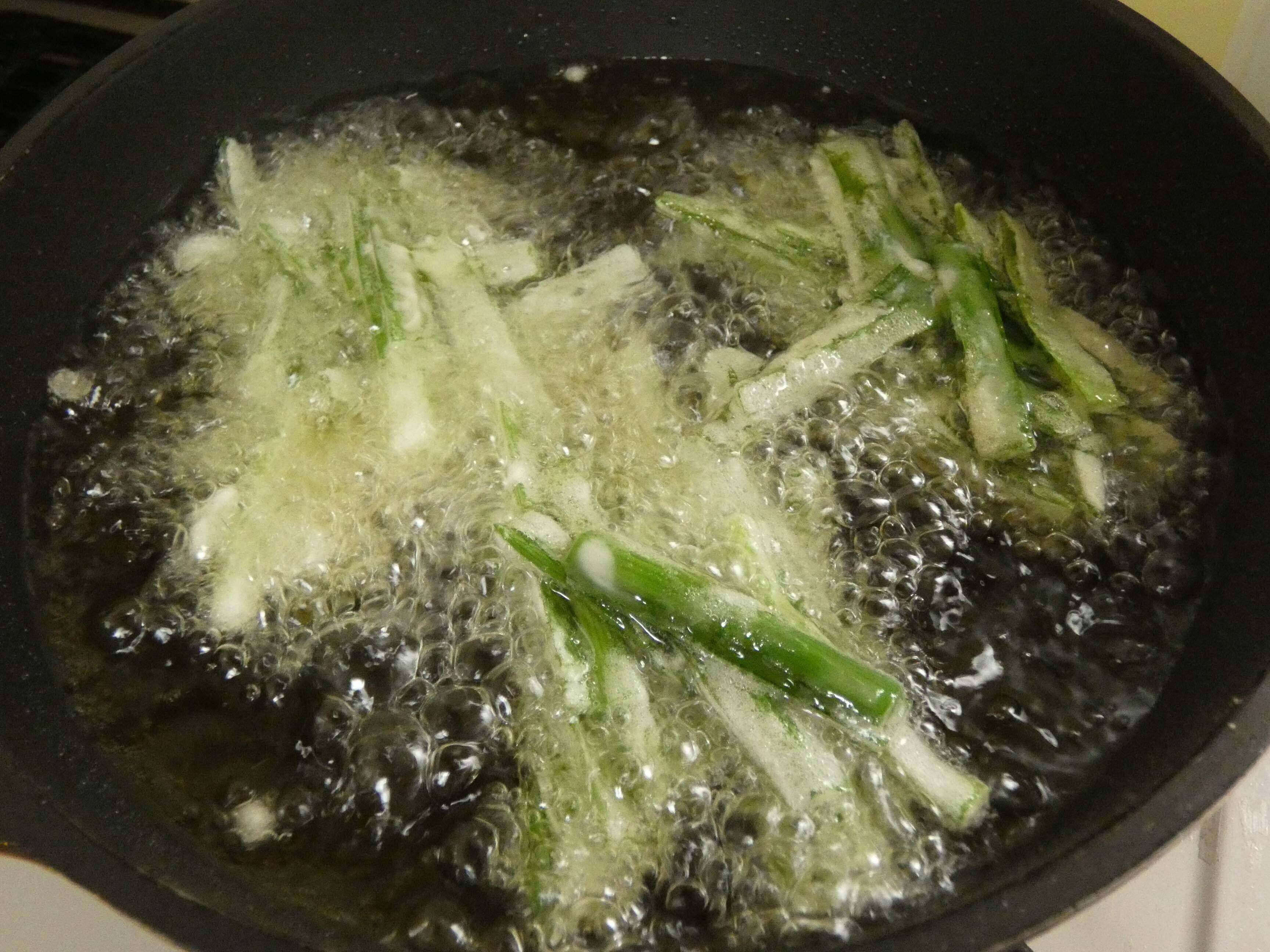 4.180度くらいの油で揚げ、両面きつね色になったら完成。お好みで塩や天つゆをつけて食べてください。