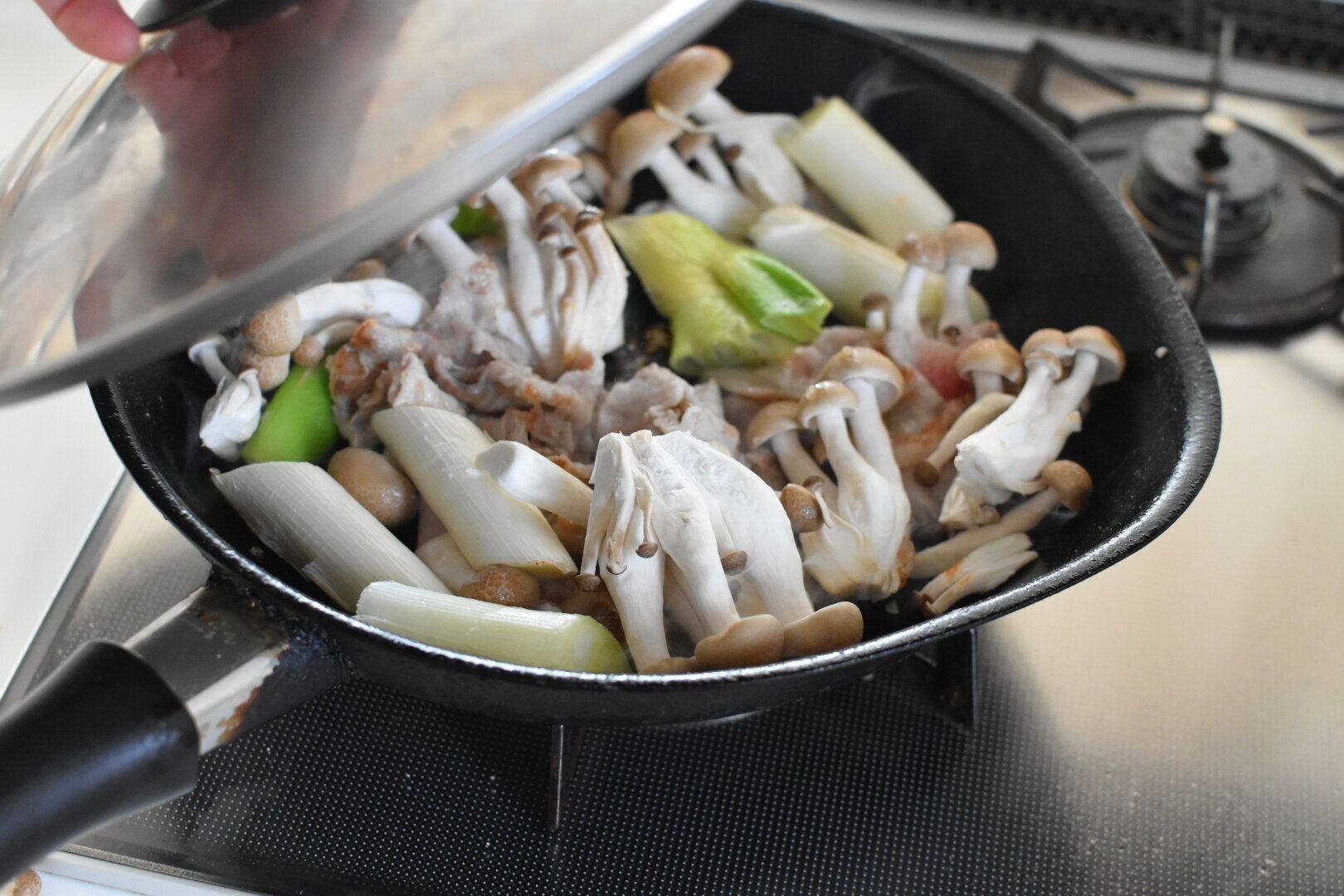 2.豚肉の色が8割ほど変わってきたら、カットした白ネギとしめじを入れる。全体をかるくなじませたらフタを閉めて弱火で3分ほど加熱する。
