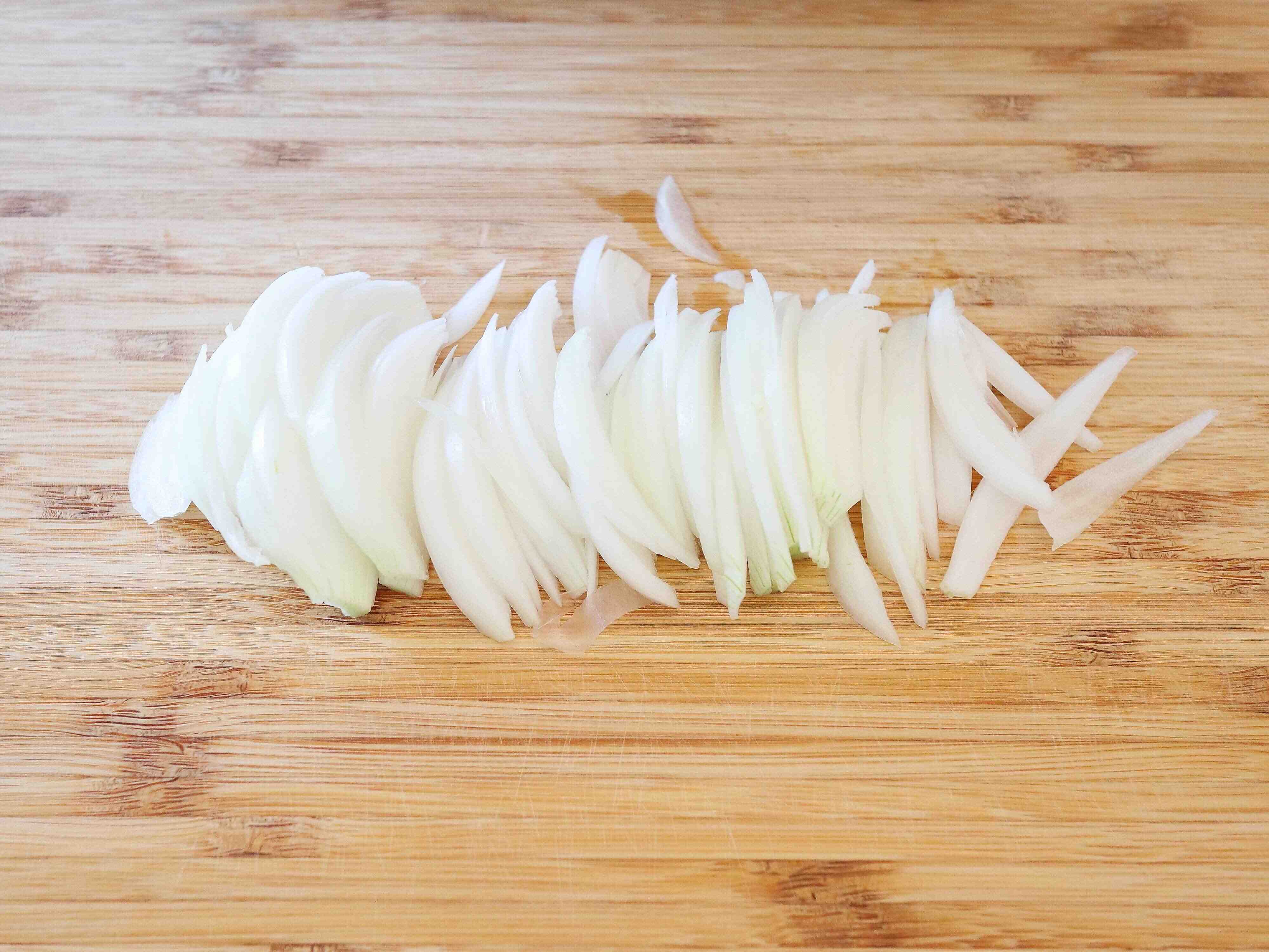 (1) 新たまねぎは皮をむき、繊維に沿って薄切りにする。
