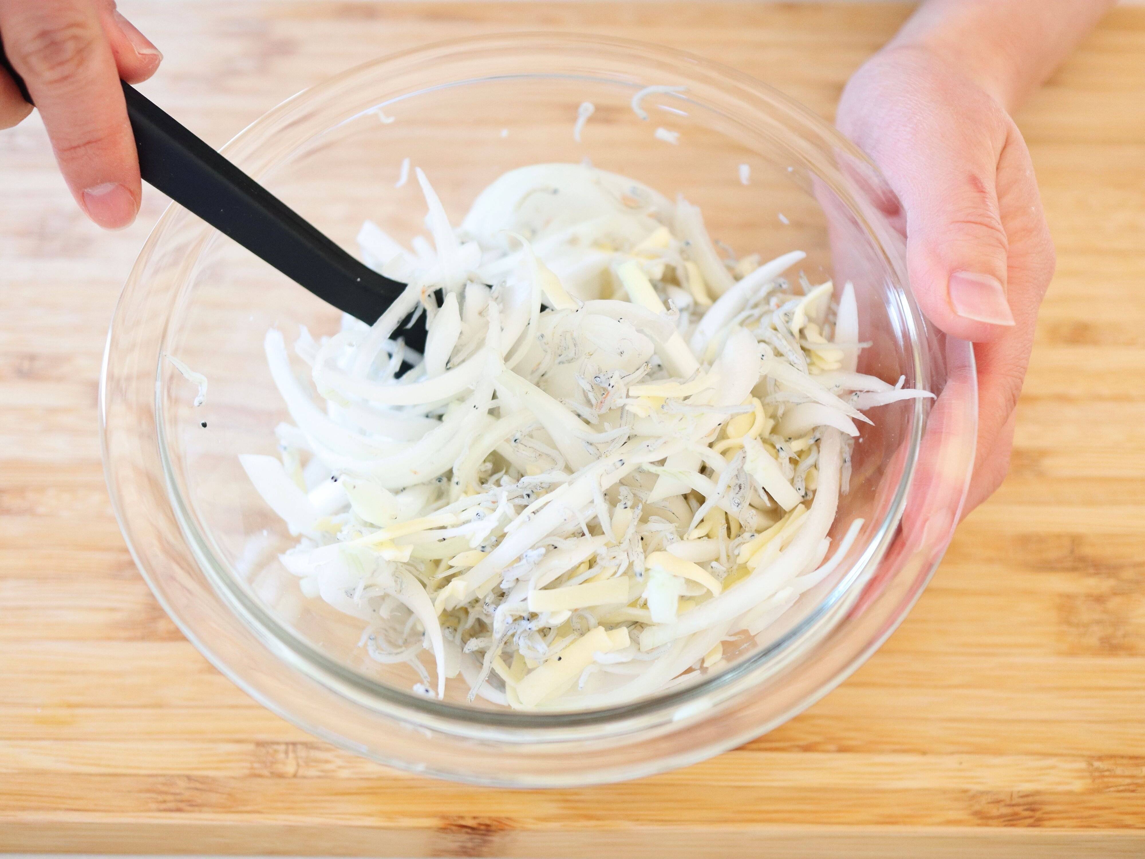 (2) 新たまねぎ、しらす、半量のチーズを混ぜ合わせる。