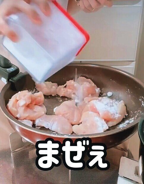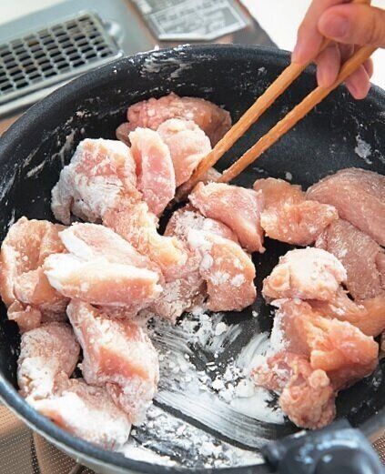 フライパンにバサァーと粉を出して肉を入れ、たりなければ追加。この中で混ぜちゃえば粉をつける容器は不要。