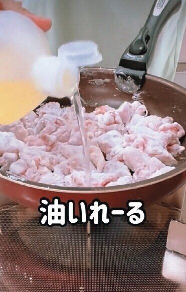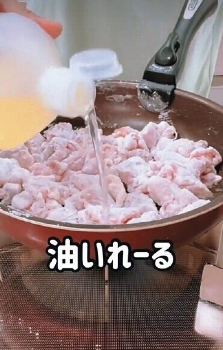 フライパンに肉を並べて、浸るくらい油を入れてから火にかけます。跳ばないし、油も最小限ですみます。