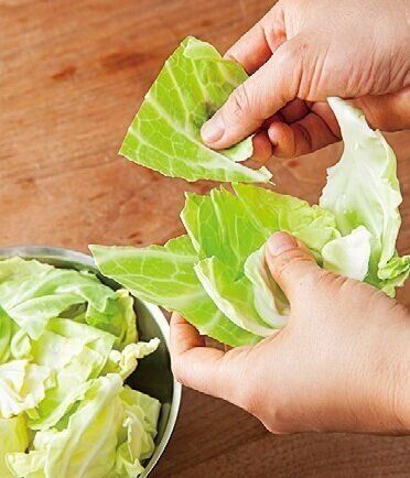 キャベツは大きめに手でちぎる。豚肉は長ければ長さを半分に(約10cm)切る。