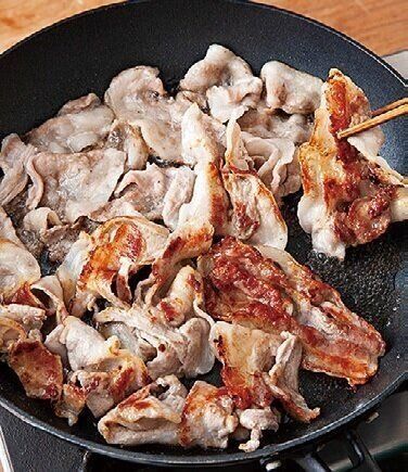 フライパンを熱し、豚肉を広げて強めの中火で焼き色がつくまで焼く。裏返し、全体に焼き色がつくまで炒める。脂が多い場合はペーパータオルである程度拭き取る。一度火を弱め、[A]を加え、豚肉にからめながら炒める。