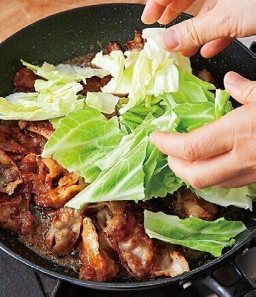 再び強めの中火にし、キャベツを加え、キャベツに7~8割火が通るまで約2分炒める。