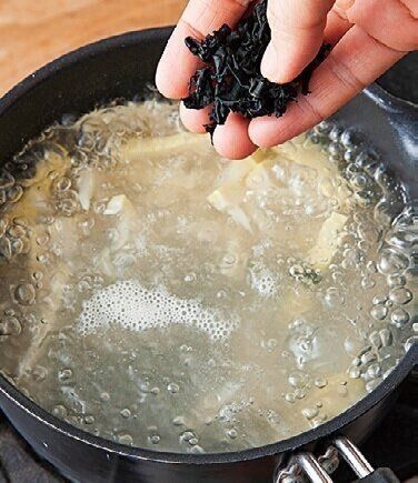 沸騰したら、わかめを乾燥のまま加えて弱火で煮る。わかめがもどったら火を止め、ごま油を加える。