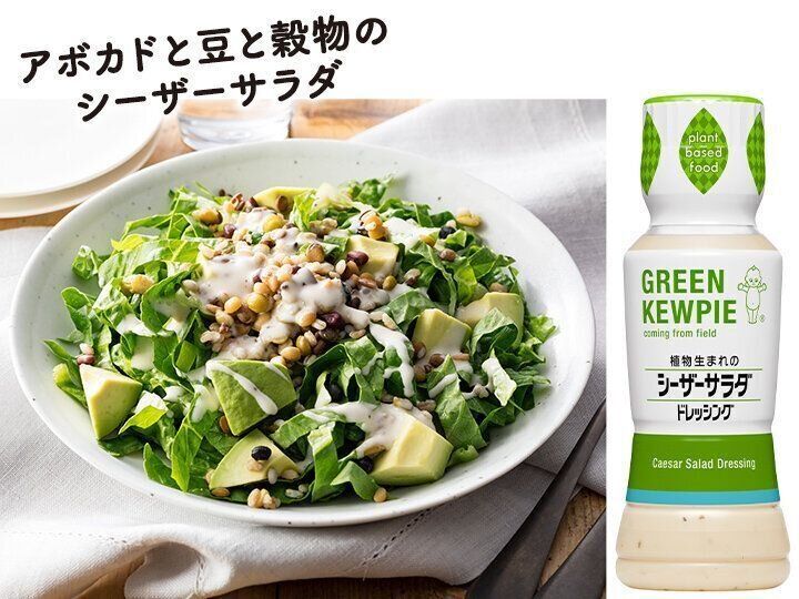 「GREEN KEWPIE 植物生まれのシーザーサラダドレッシング」は、卵も乳も不使用とは思えないまろやかなコクが特長。豆乳や味噌、豆乳発酵調味料といった植物性原材料を使いこなしたうま味が野菜を引き立ててくれます。