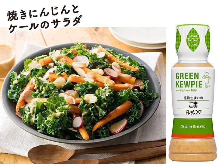 「GREEN KEWPIE 植物生まれのごまドレッシング」は、すりたてのごまの風味とまろやかなコクが楽しめる植物性原材料で作られたドレッシング。焼きにんじんとケールのサラダにとってもよく合います。