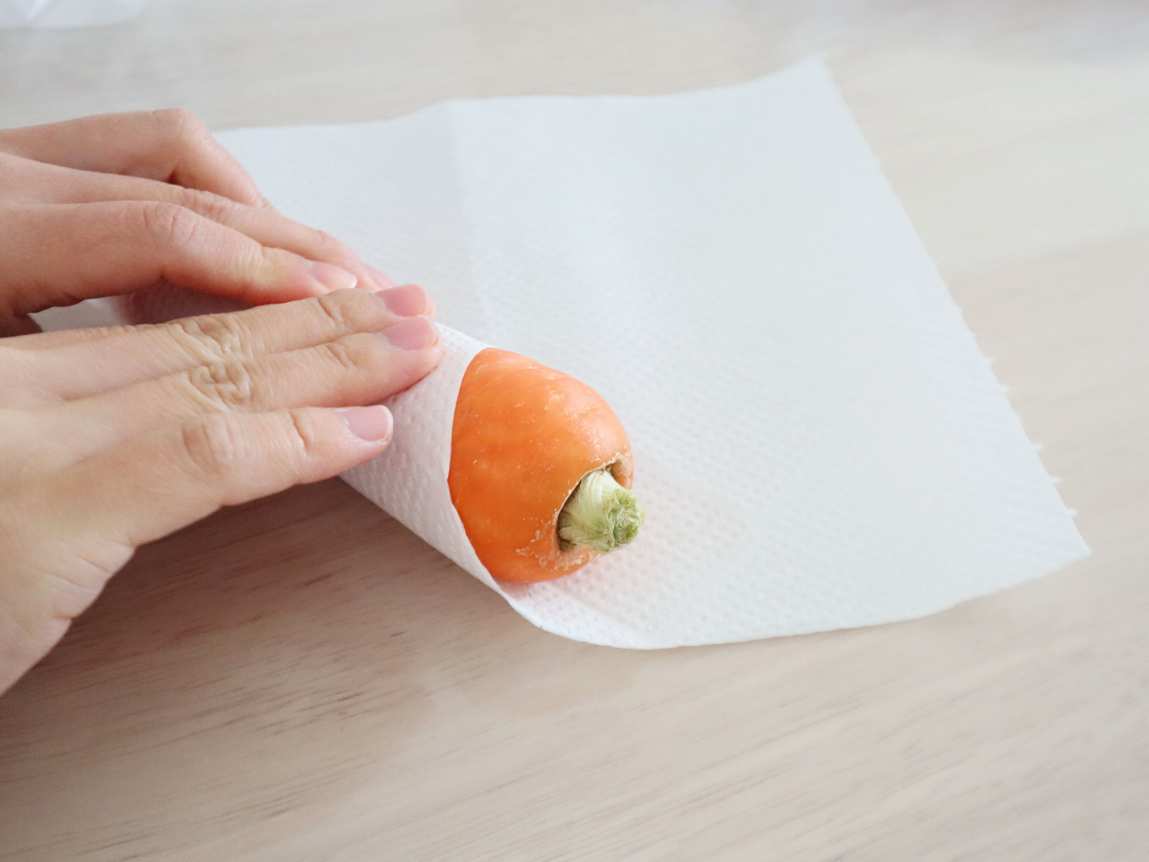 (1) にんじんをキッチンペーパーで包む。(洗わずそのままでOK)