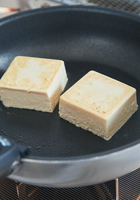 (1)のフライパンに豆腐を入れて、両面に焼き目がつくまで焼いて(1)の器に盛る。