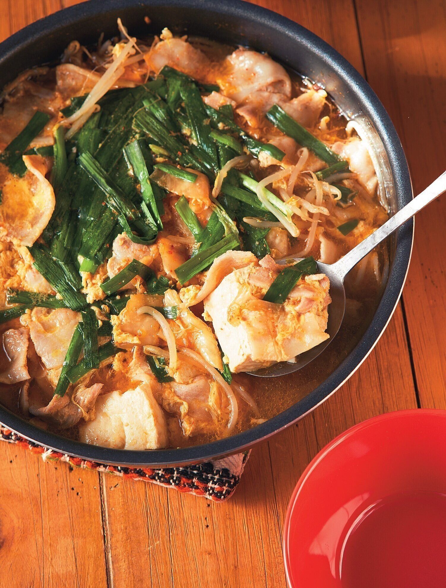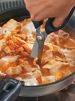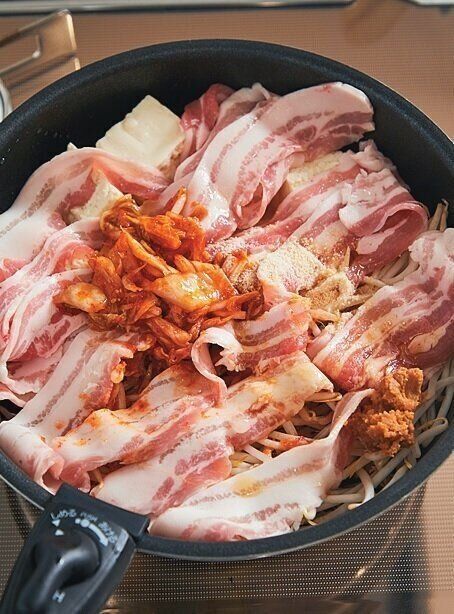 フライパンにキムチ、もやし、一口大に切った豆腐を入れ、上に豚肉を広げる。[A]を加えて煮立たせ、ふたをして豚肉に火が通るまで中火で煮る。豚肉は煮えたらキッチンばさみで一口大に切る。