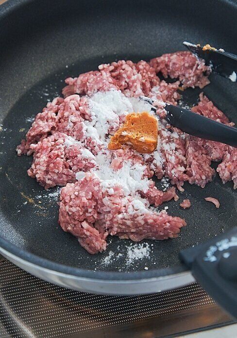 続いてひき肉、片栗粉、みそをフライパンに入れ、軽く混ぜてから中火にかけて炒める。