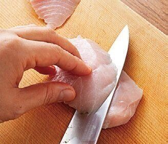 切り身魚をそぎ切りにすると表面積が大きくなり、見栄えがアップ。身が薄くなるので火も早く通る。