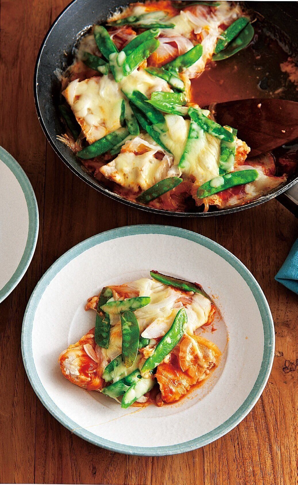 ケチャップを全体にかけ、玉ねぎ、きぬさや、チーズを散らす。ふたをして中火で5~6分蒸し焼きにする。