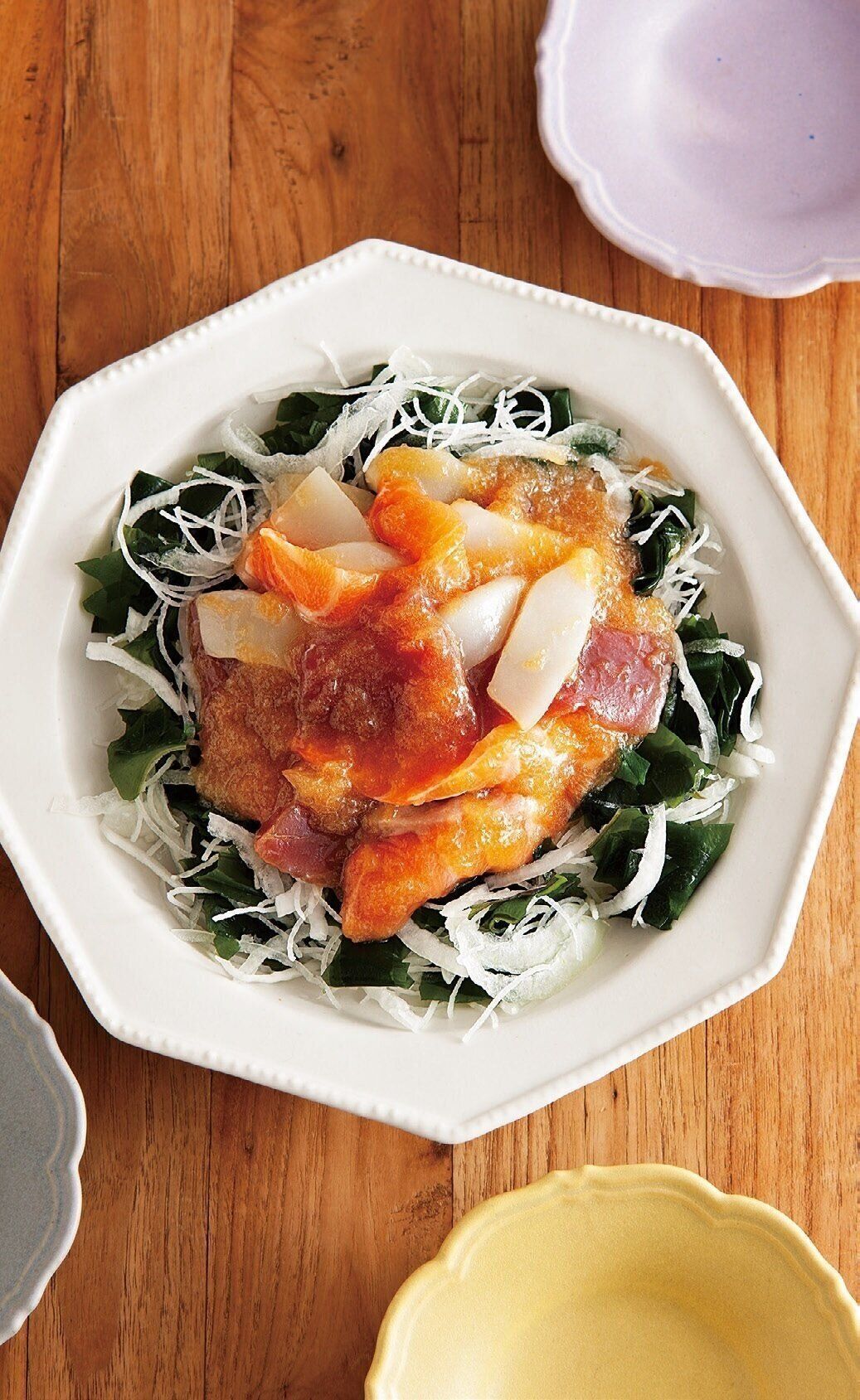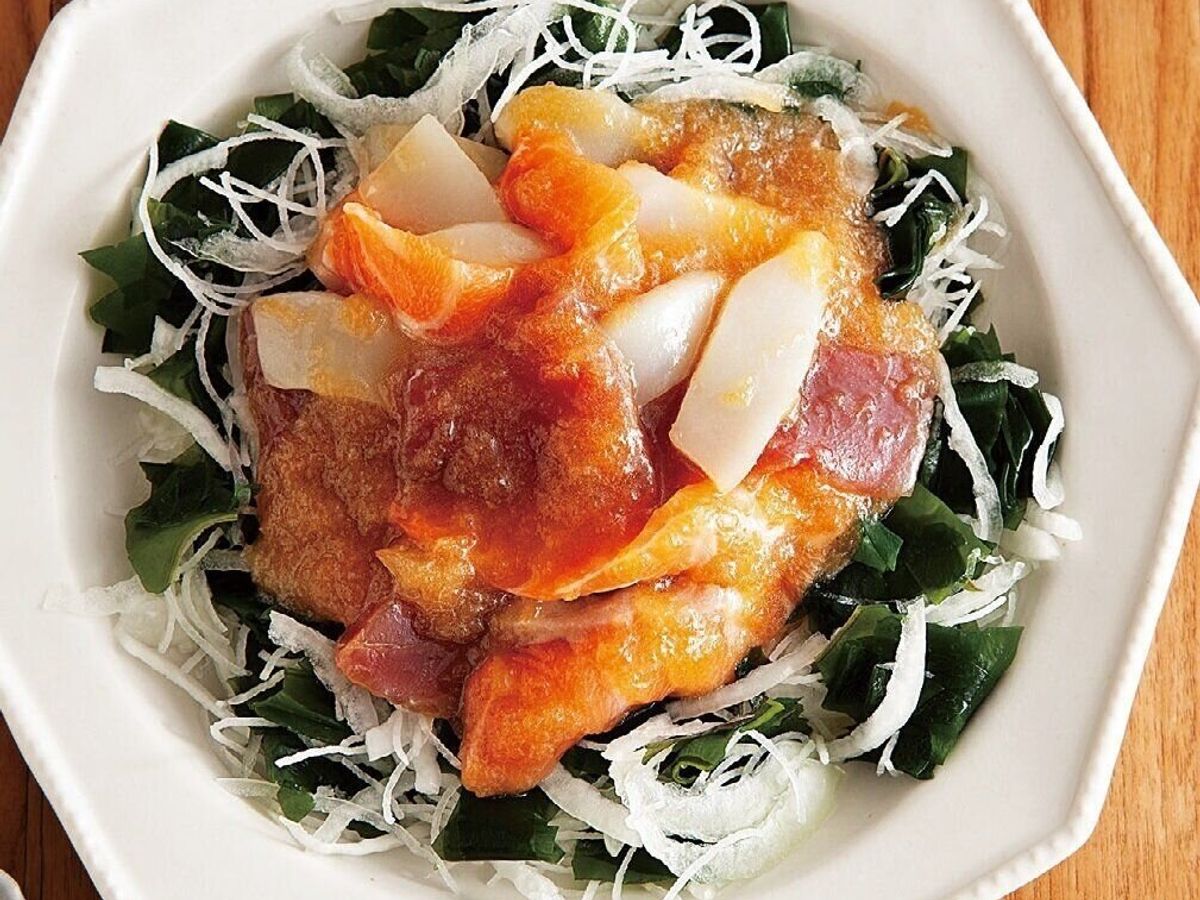 しょうゆマリネの刺し身とわかめ&玉ねぎがおいしいハーモニー。