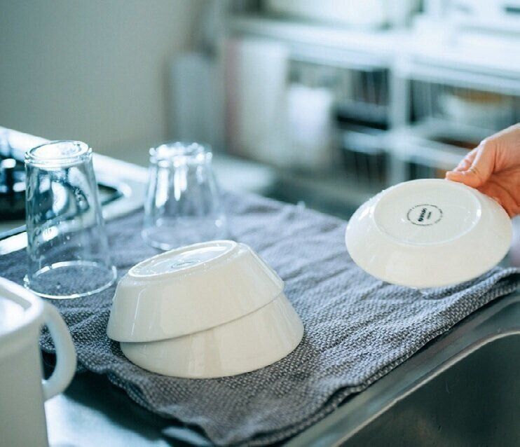 コットン100%で吸水性抜群のタオルは「ジョージ・ジェンセン」の物。大判で厚手なので食器をたくさん置いてもビチャビチャしません。乾きが速いので、乾かして1日に何回も使えます。