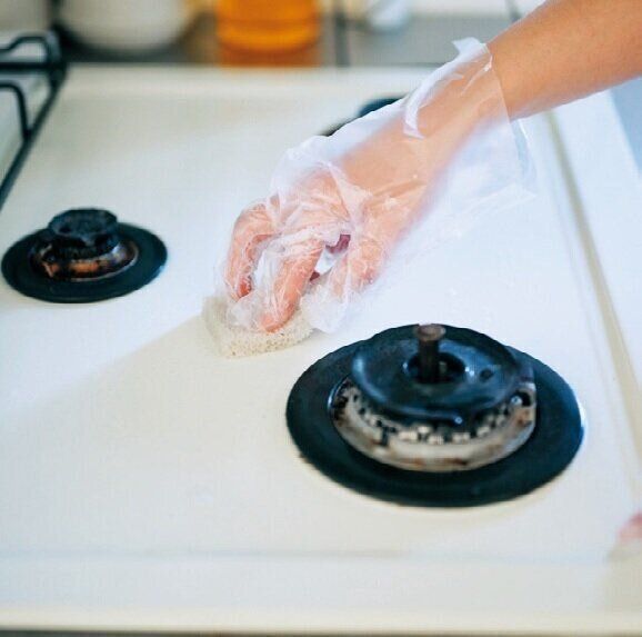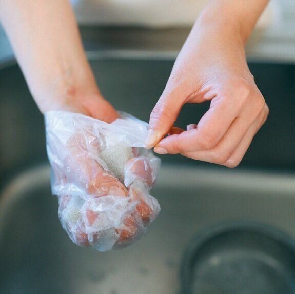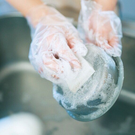 夕飯の後片づけの流れで掃除が完了。ガシガシこすらなくても汚れが落ちます。使い捨ての手袋を使っていますが、最後に汚れた排水口ネットとスポンジを握ったまま、くるっとひっくり返すことで、一度もヌメヌメに触れることなくポイッと捨てられるのもポイントです。