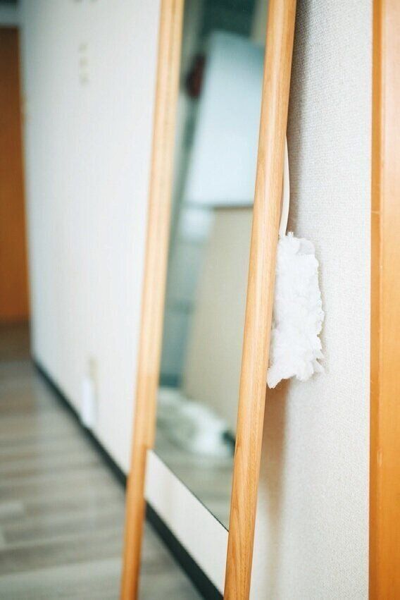 1つの掃除道具を使い回すのではなく、ホコリや毛が気になる場所ごとに道具を配置。「実用的な掃除道具が、見える所に置いてあると、生活感が出てしまうので、死角に置くことが重要。鏡のモップは壁との隙間を見たときに、ココに置ける!とひらめきました。納戸は棚の奥を活用して使用頻度の低い掃除道具をIN」。