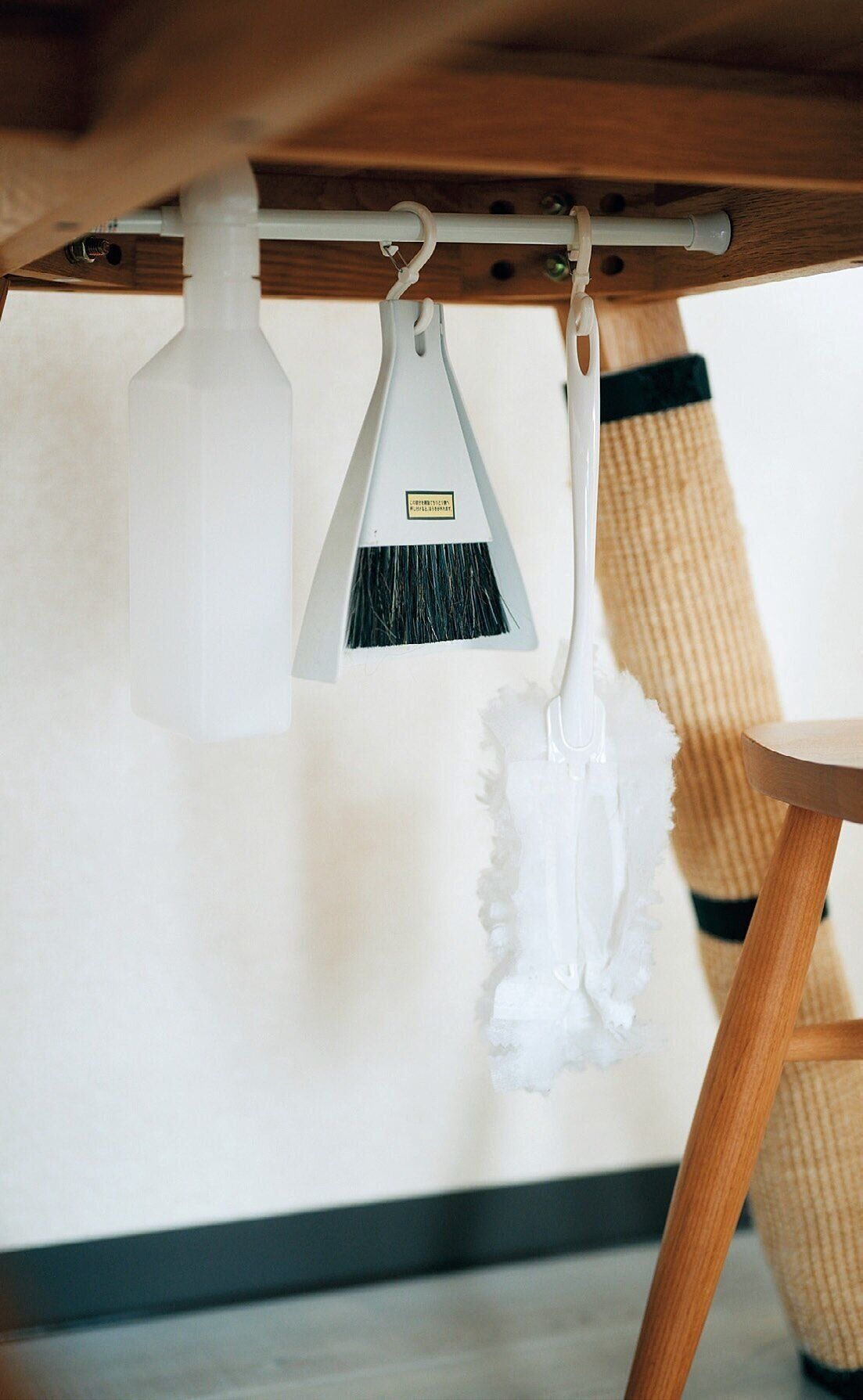 突っ張り棒とS字フックで掃除道具を掛けています。「テーブルの下なら目立たないし、座ったまま手に取れる最高の置き場所。ティッシュもテーブルの脇に、魔法のテープと呼ばれる両面テープで貼り付けています」。