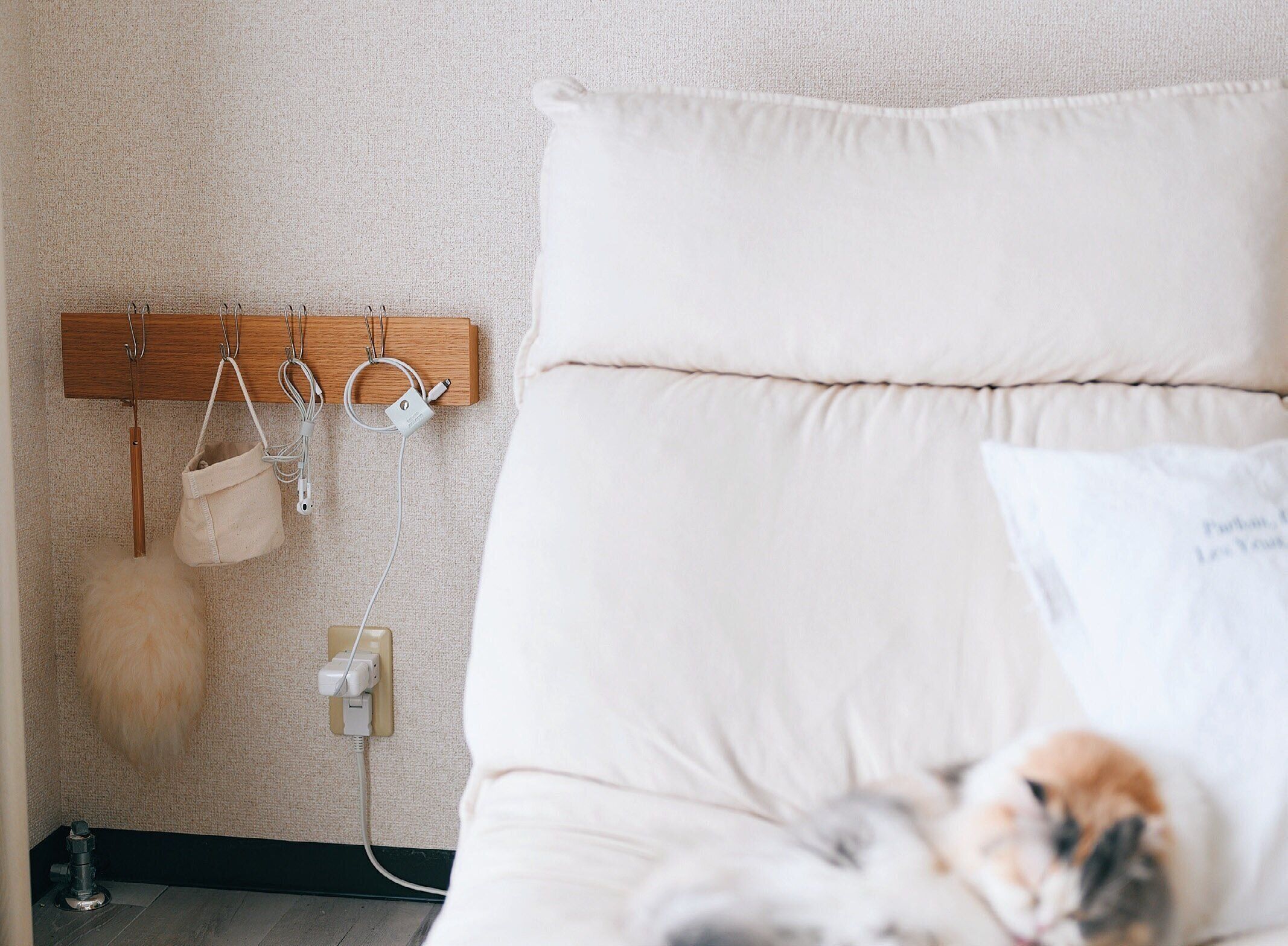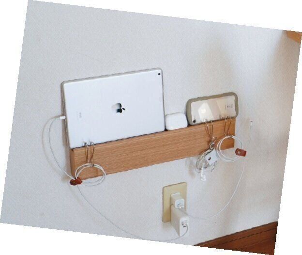 スマホやタブレットのコードが、からまりまくっていた充電ステーション。そんなカオスはコードを束ねて、留めて解決。長押を置き場所にしたら、ワンアクションで取れて使いやすい。