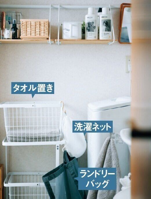 洗濯機まわりが狭くて洗濯かごが置けなかったので、かごではなくメッシュのランドリーバッグに。バッグなら省スペースで、S字フックさえあればどこでも引っかけられます。