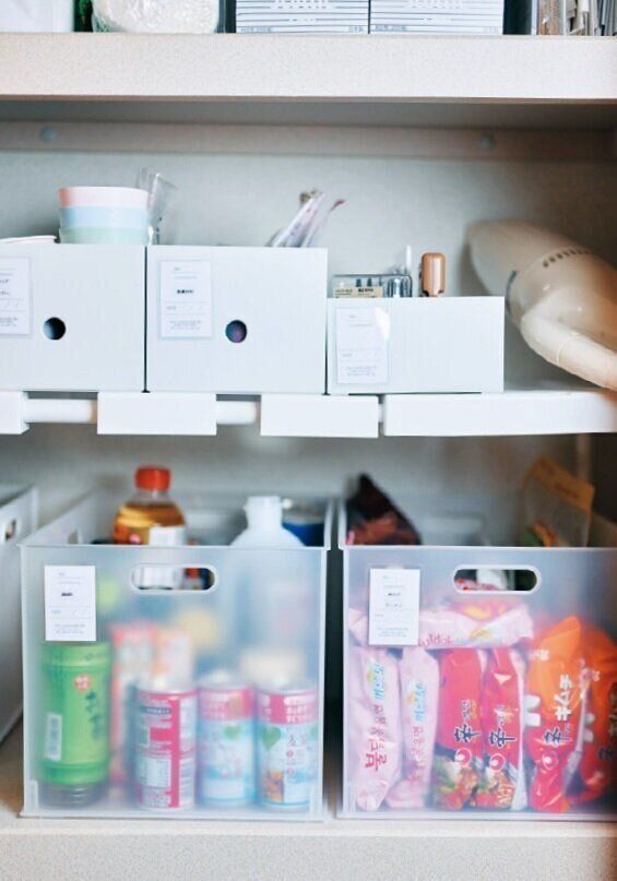 棚からかごや箱を引き出さないと、ものがしまえないのはNG。引き出さずにしまえるポイントは、かごと棚板の間に手が入る隙間を確保すること。棚いっぱいにものを収納しないのが戻しやすさの秘訣です。
