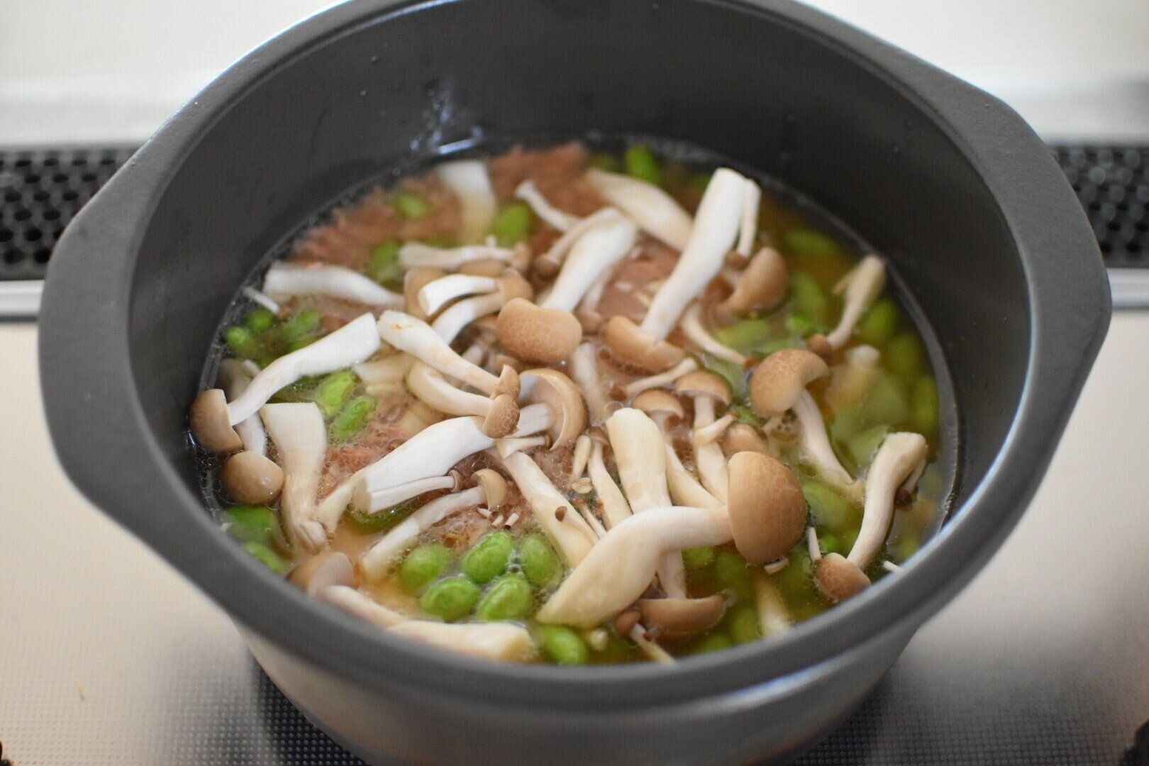 1.水気をきったお米にツナフレークを汁ごと加え、ほぐしたしめじとむき枝豆も乗せてAを加える