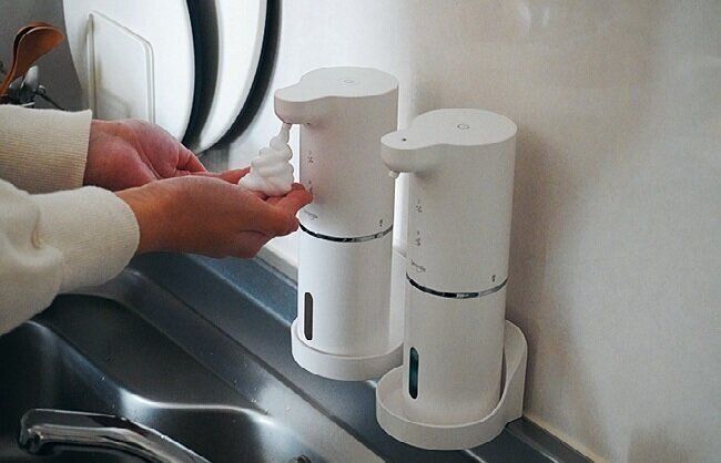 手をかざすだけで適量の洗剤が出てくるので超ラクチン。食器洗い中、スポンジにつぎ足すのがラクだし、より衛生的に手洗いできるのも最高です。/ユミマイルの「自動ソープディスペンサー」各¥3,460
