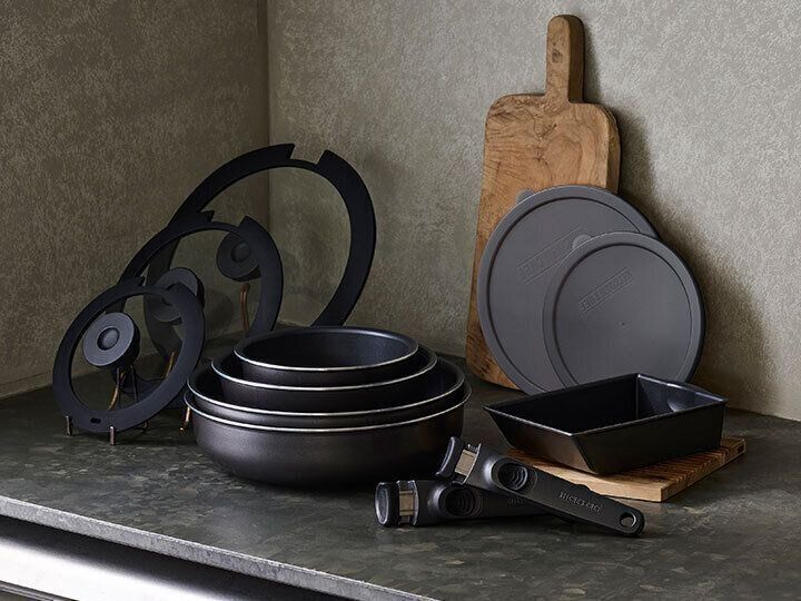 取っ手は、ワンタッチハンドルなのでカンタンに着脱OK。握るだけでしっかりロックし、取り外すときはスライド解除するだけ。セット品にはフライパンだけでなく、エッグパン、マルチハンドル、ガラスふた、シールふたがついていて、6点セット、9点セット、12点セットがありバリエーションも豊富。各家庭の用途に合わせて揃えられるんです。取っ手が外せて重ねられるから、場所を取らずに収納できる省スペースタイプ。付属のシールふたを使えば、フライパンは冷蔵保存容器としても使えて、一石二鳥。