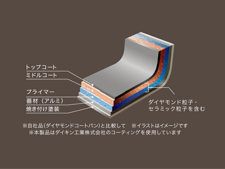 新コーティングの「TERACORT(テラコート)」は、非粘着性に優れているフッ素樹脂をトップコートに使用することで、アイリスオーヤマ史上最強のこびりつきにくさ(滑り)を実現しました。また、3層コーティングに極小セラミック粒子とダイヤモンド粒子を配合しており、ミドルコートには硬度が高い特殊コーティングを使用しています。これによりトップコートの摩擦と抵抗が少なくなり、耐摩耗性試験200万回クリア(※)の高い耐久性能を持っています。だからこびりつきにくいんです。汚れもスルッと落ちるから、お手入れは簡単。調理時間の短縮にもお役立ち。