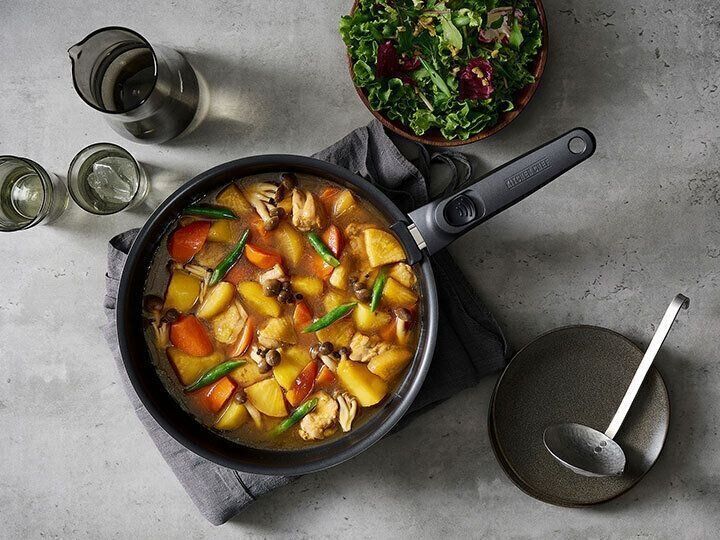 今回ご紹介するのは、通常のフライパンより深さのある深型タイプ。深さがあるから、一度にたっぷり作れて、食材がこぼれにくく、油の飛び跳ねも少ないという長所も。そして、フライパンだけじゃなく鍋としても使い回せるんです。フライパン一つで、炒め物からスープやパスタ、煮物、汁物なども作れる万能フライパンです。