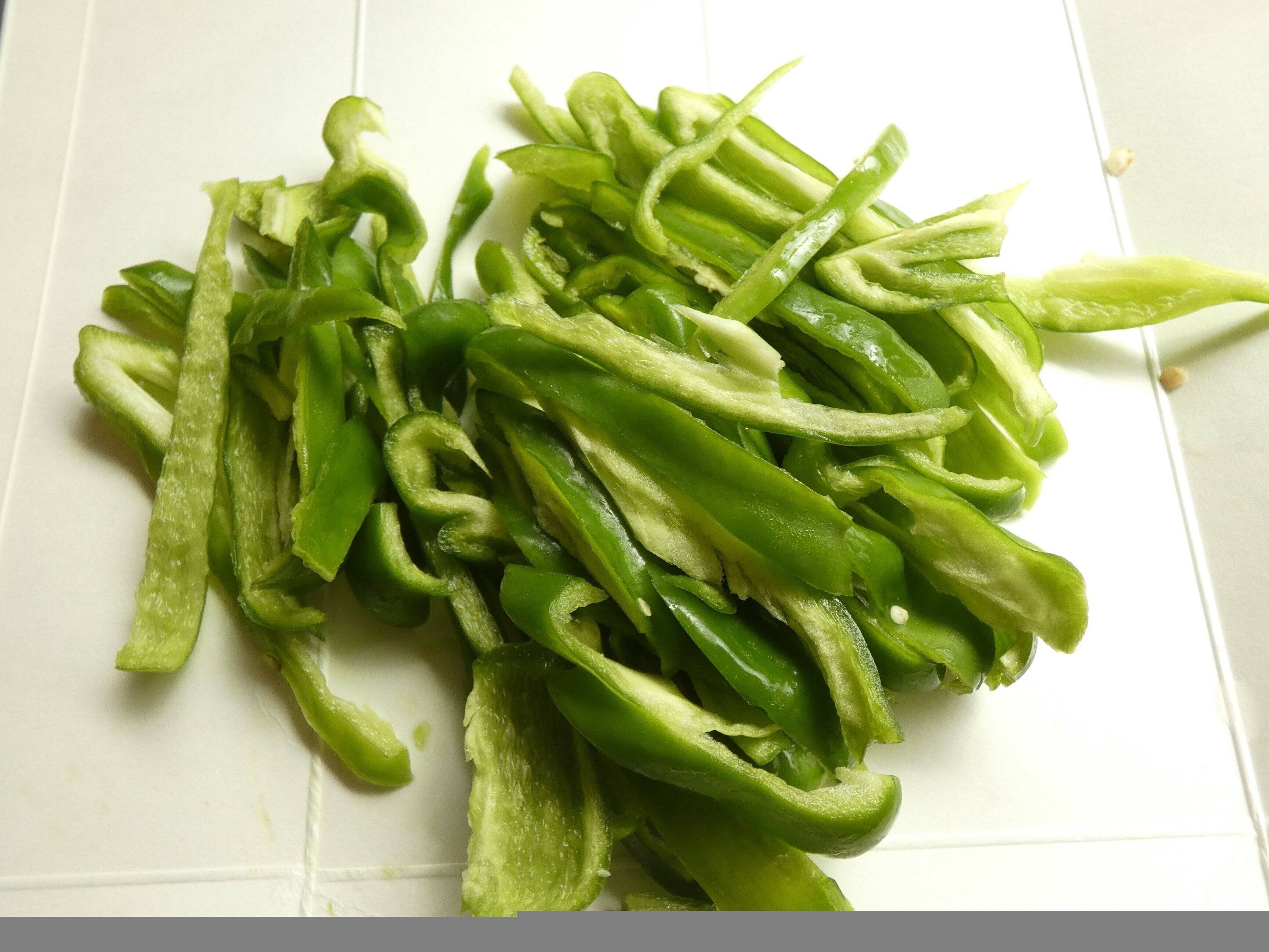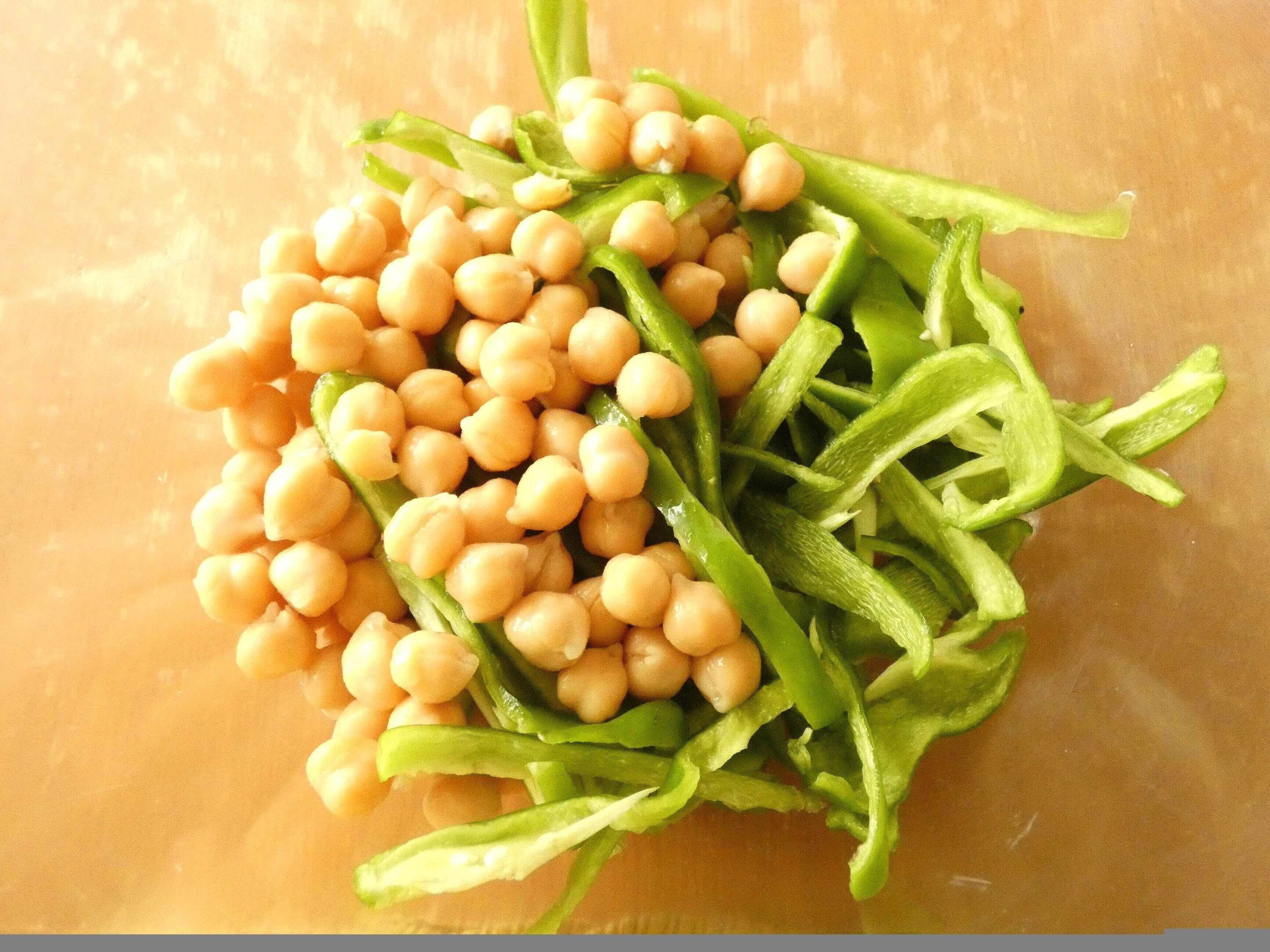 1.ひよこ豆は水切りします。ピーマンは半分に切って種とヘタを取り、細切りにします。