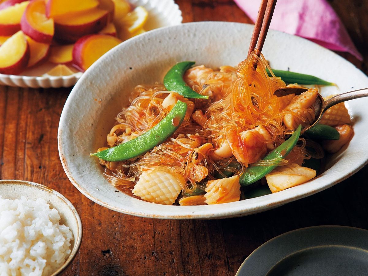 (2)フライパンにごま油を中火で熱し、(1)を約3分炒める。オイスターソース煮の黄金比率、春雨、スナップえんどうを加え、煮立ったら、汁けが少なくなるまで混ぜながら5~6分炒め煮にする。