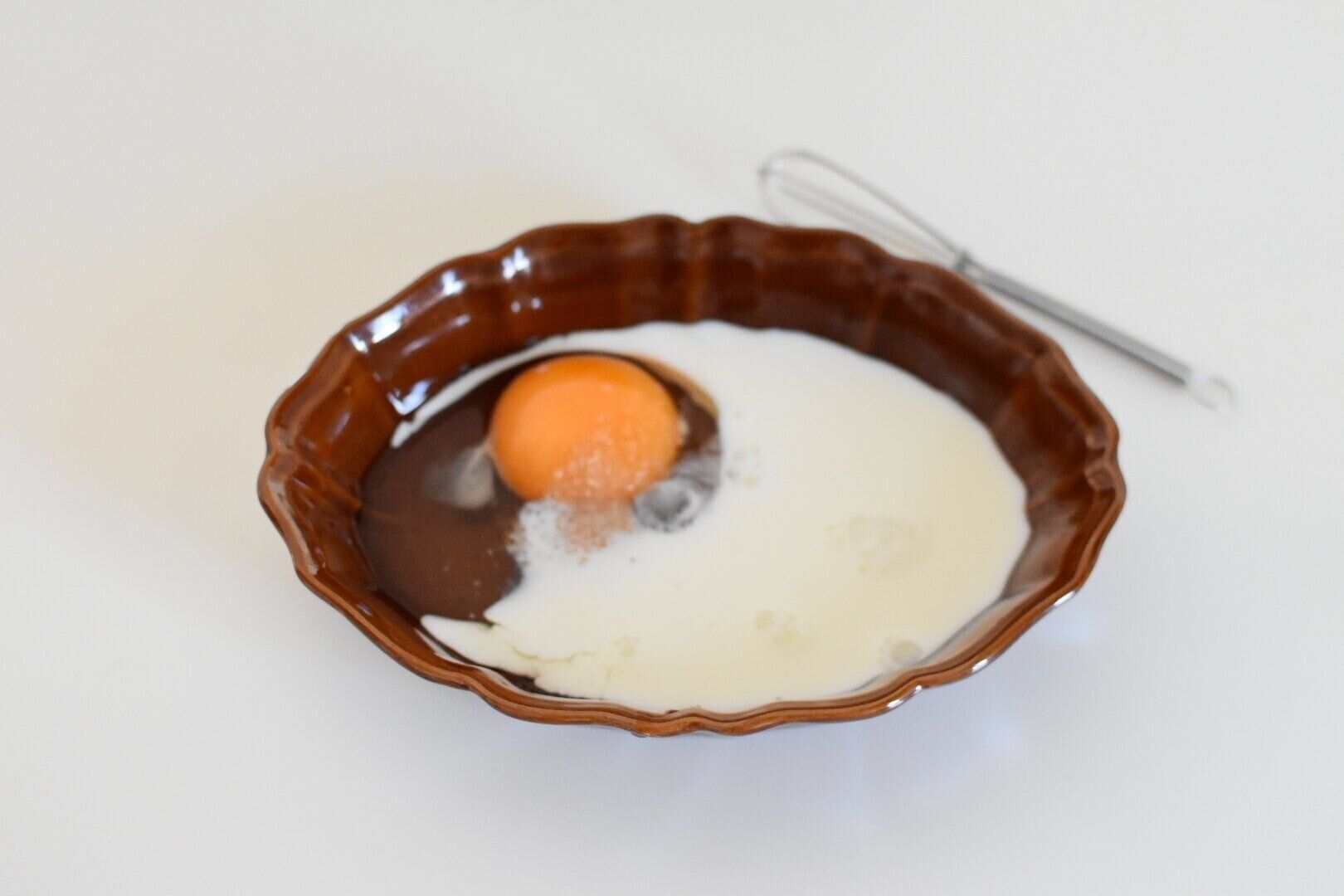 2.グラタン皿などの耐熱容器に卵を割りほぐし、砂糖、牛乳を加えてしっかり混ぜ合わせたら、カットした食パンの両面に卵液を染みこませてアルミホイルをかぶせる