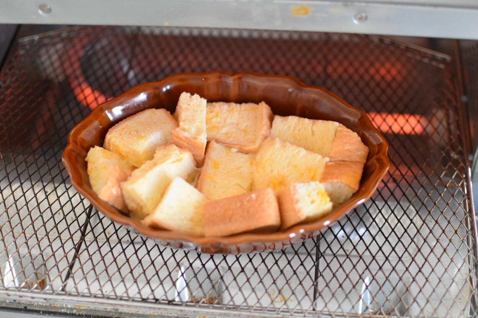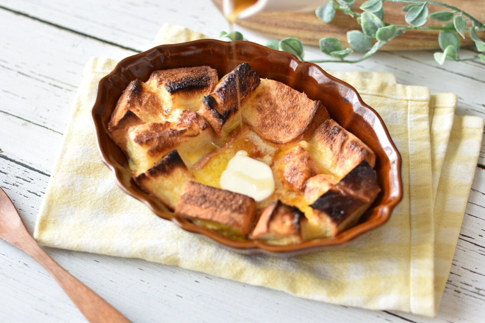 フライパンで焼いてもいいけど、グラタン皿などの耐熱容器で作ると洗い物を減らすことができます。こんがり焼けたパンがサクサクで、メープルシロップとの組み合わせがたまりません。