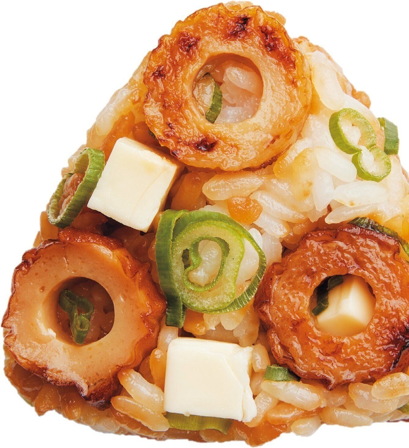フライパンにごま油を中火で熱し、ちくわを色よく炒めて、しょうゆを加える。火を止めて、ご飯とチーズ、ねぎを加えて混ぜ、おにぎりにする。