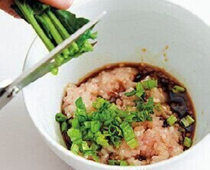 耐熱容器に[A]を入れて混ぜ、ひき肉とほうれん草を加えて混ぜる。ふんわりとラップを掛けて電子レンジ(500W)で3分加熱し、ご飯に混ぜて(汁気があれば切る)、おにぎりにする。