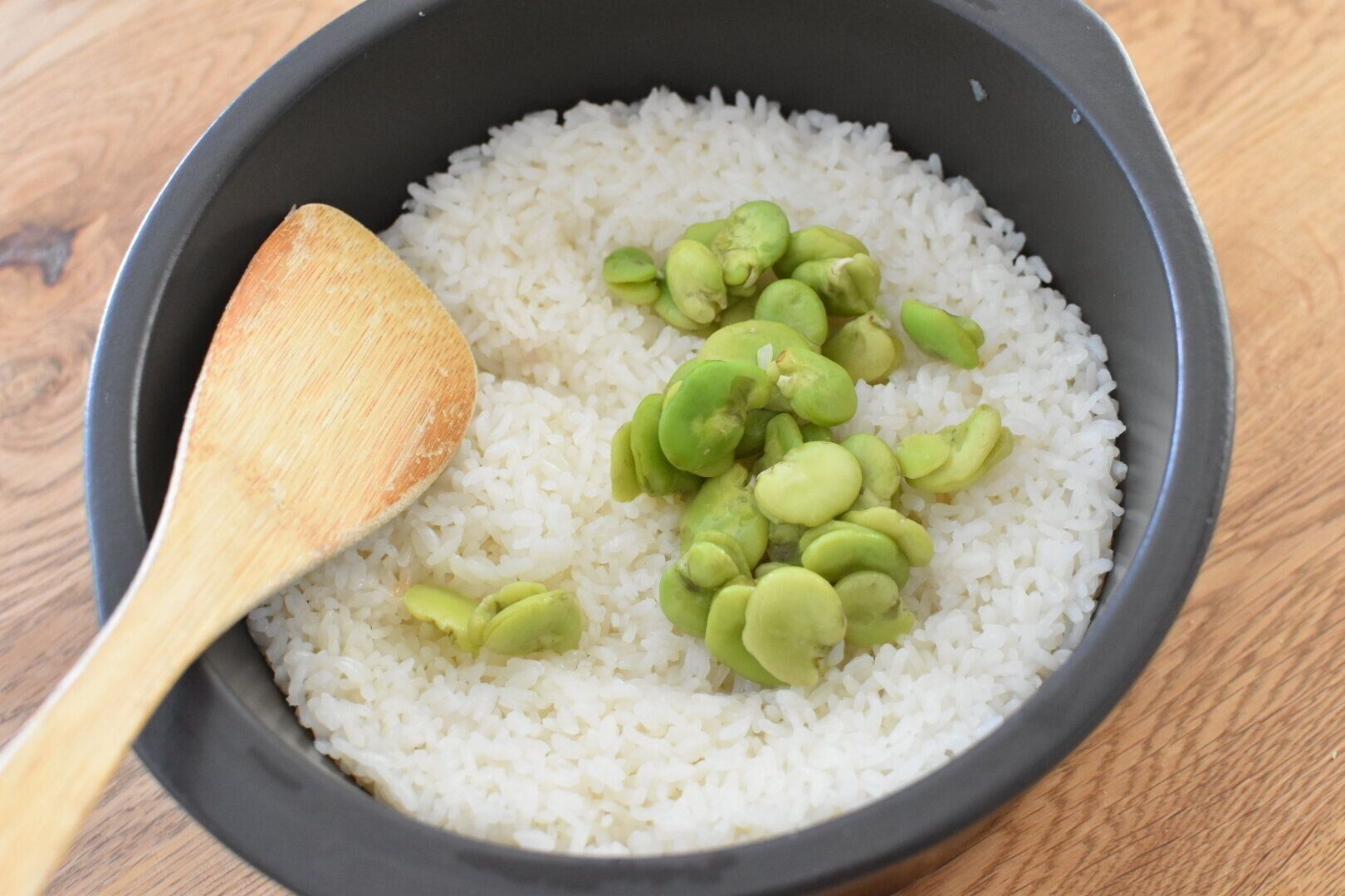 3.ごはんが炊けたら、さやを取りのぞいてそら豆をまぜこむ